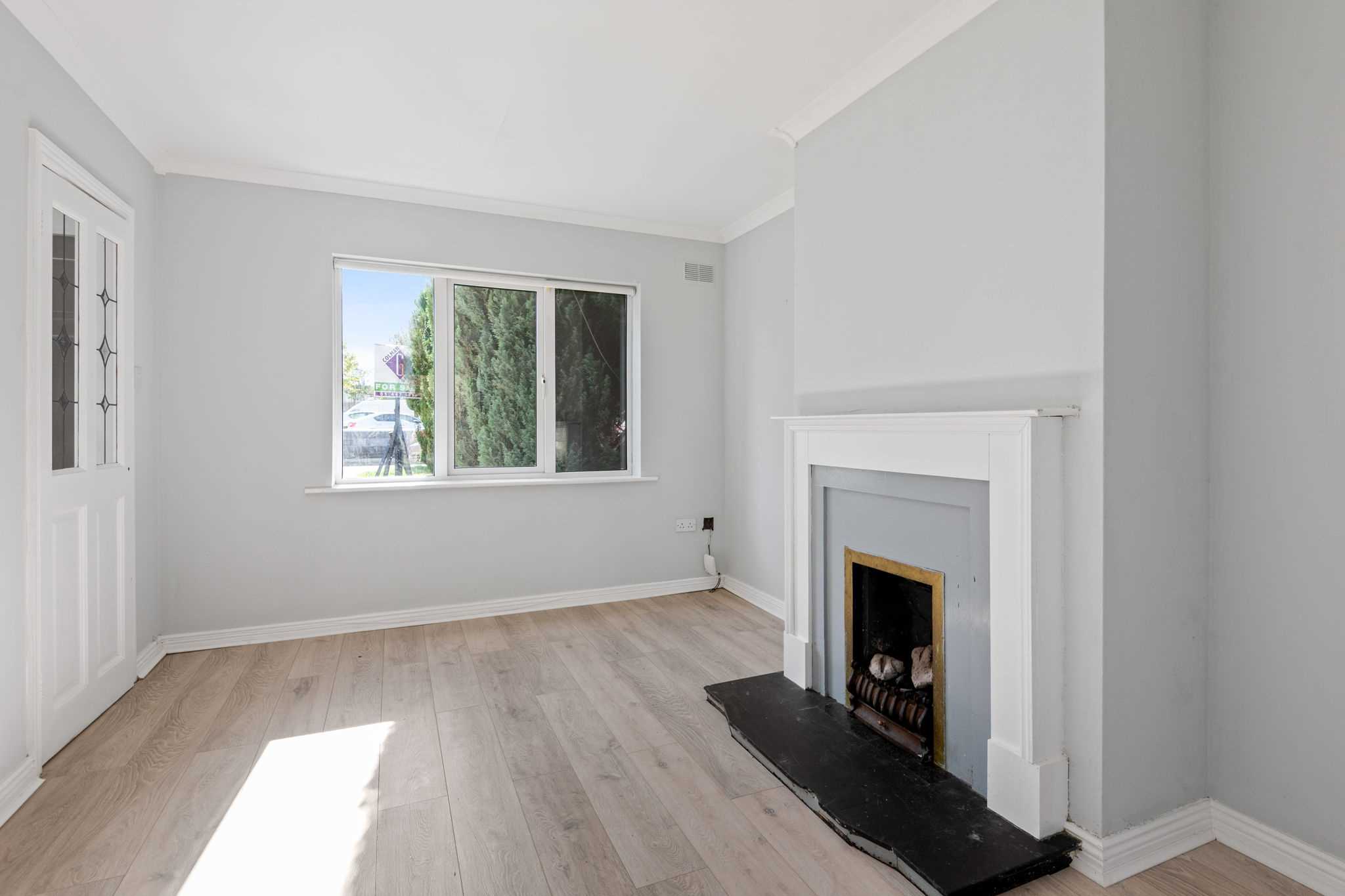 Living room (c. 4.18 m x 3.13 m) – Laminate timber flooring – Gas fireplace with timber surround – Double door to kitchen/dining room