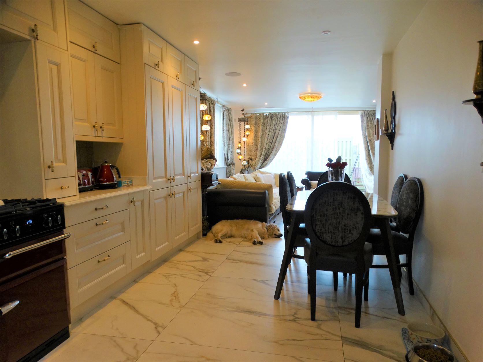 Kitchen (c. 6.08 m x 3.08 m) – Bespoke fitted kitchen with cream units, quartz marble counter top & vintage mirror splash back – High specification appliances including, American style fridge freezer with water dispenser, Belfast double sinks, Stanley cooking stove with 5 x ring gas hob, Recessed integrated extractor hood & Double drawer dishwasher unit – Extra-large Calquatta quartz marble tile floor – Incorporating dining area
