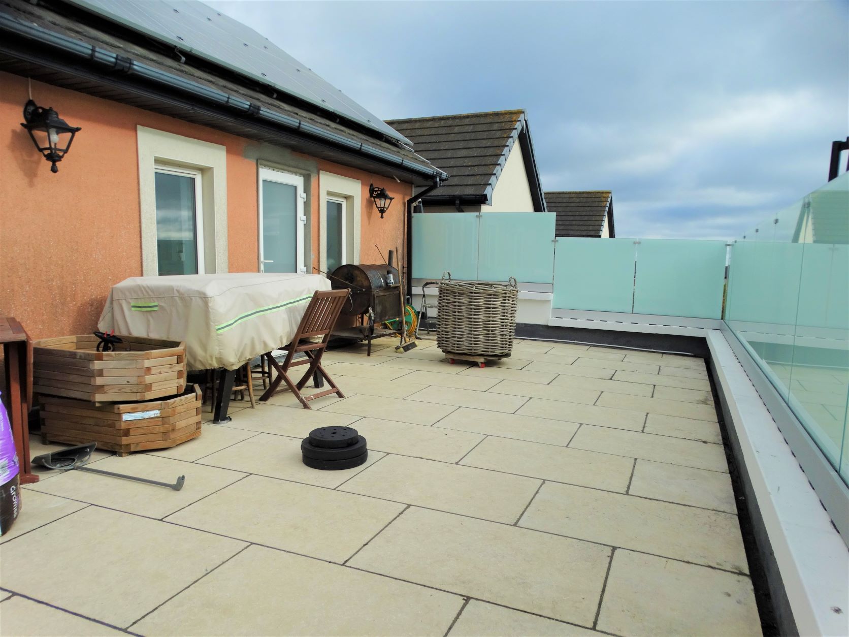 Balcony (c. 9.13 m x 4.35 m) – Impressive South facing aspect patio balcony area with panoramic sea & countryside views – High specification frosted glazed surround – Egyptian tile floor with high levels of insulation underneath – Extends to 40 sqm in size – Attic access via stira steps – 15 x panel solar system situated on the south facing roof