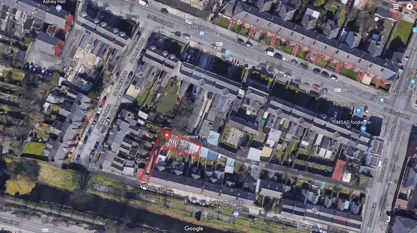 The existing footprint consists of one largecleared yard & rear gated laneway access off Donore Avenue & Frontvehicular access from Lullymore Terrace.