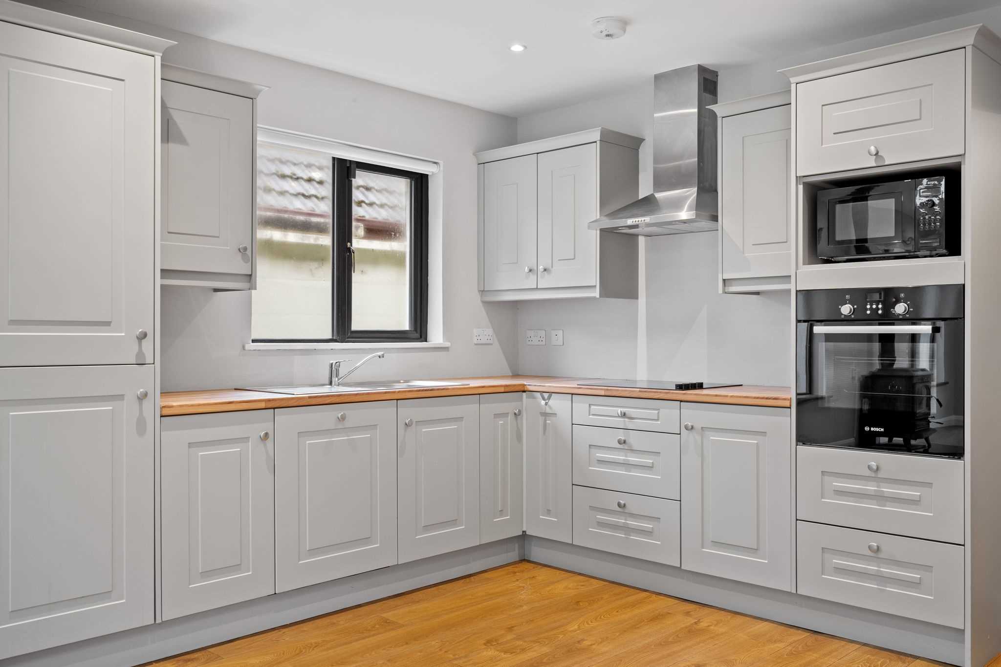 Kitchen (c. 3.39m x 4.07m) – Light Olive Units with Wood Effect Countertops – Single Oven with Microwave Overhead – Electric Hob with Stainless Steel Extractor Overhead – Integrated Fridge & Freezer – Integrated Dishwasher – Laminate Timber Flooring